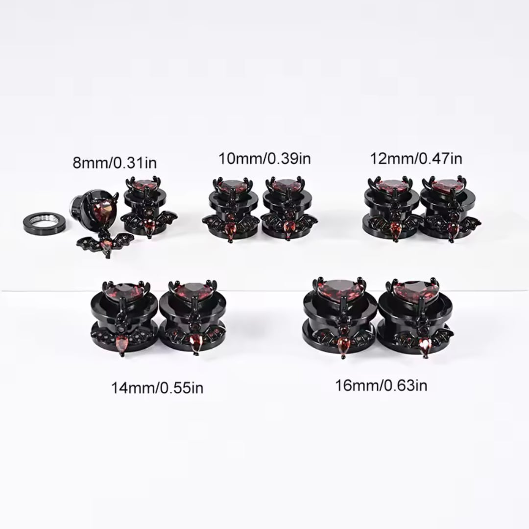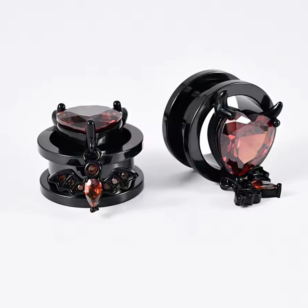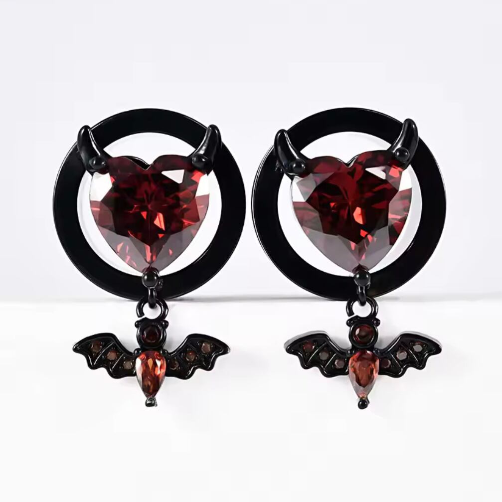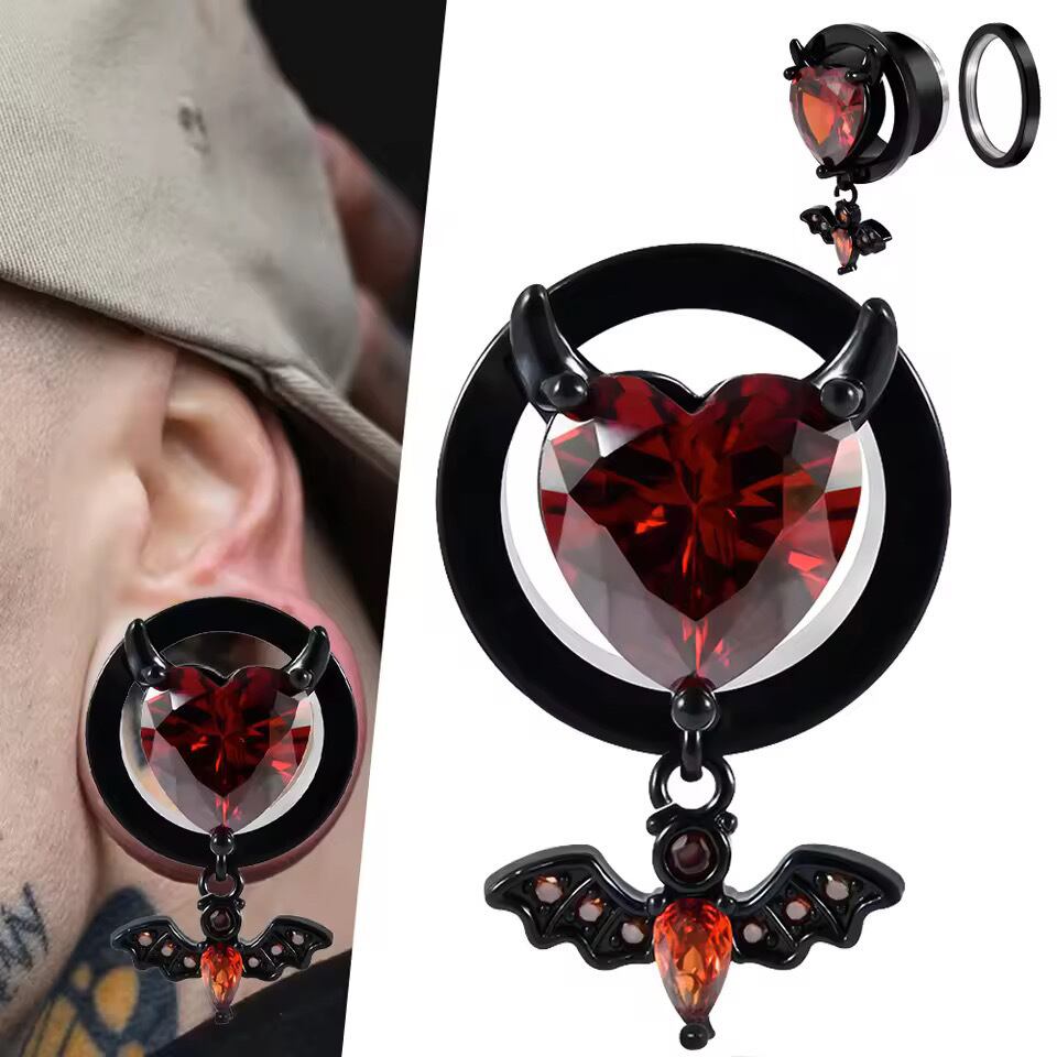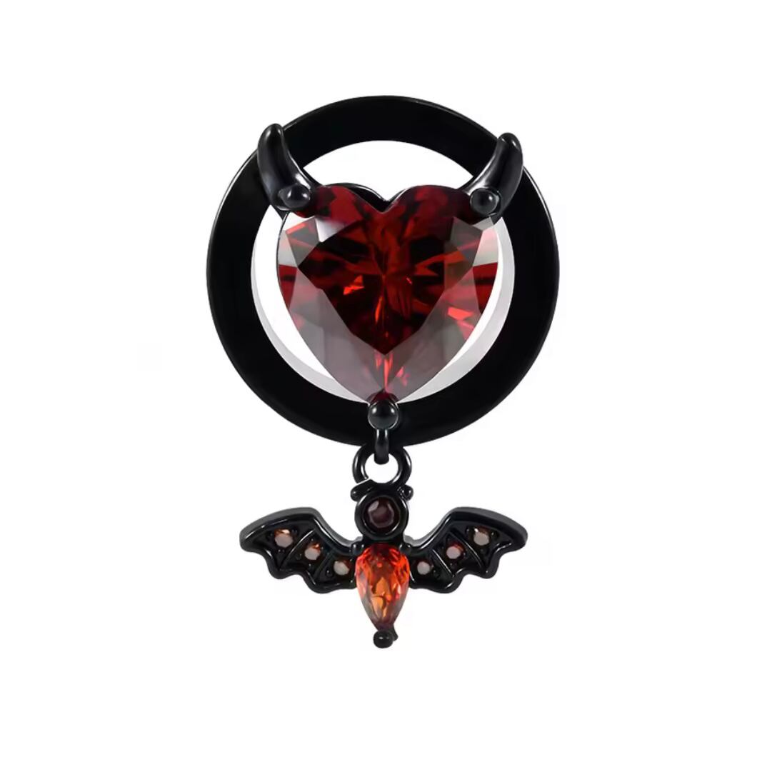 287:ボディピアス フレッシュトンネル 黒 赤 ブラック レッド ハート こうもり ゴシック 不気味 ハロウィン 揺れる大きいサイズ 8mm 10mm 12mm 14mm 16mm ジルコン