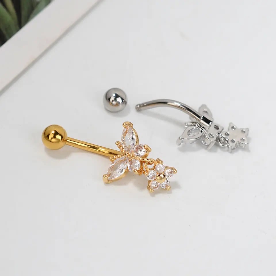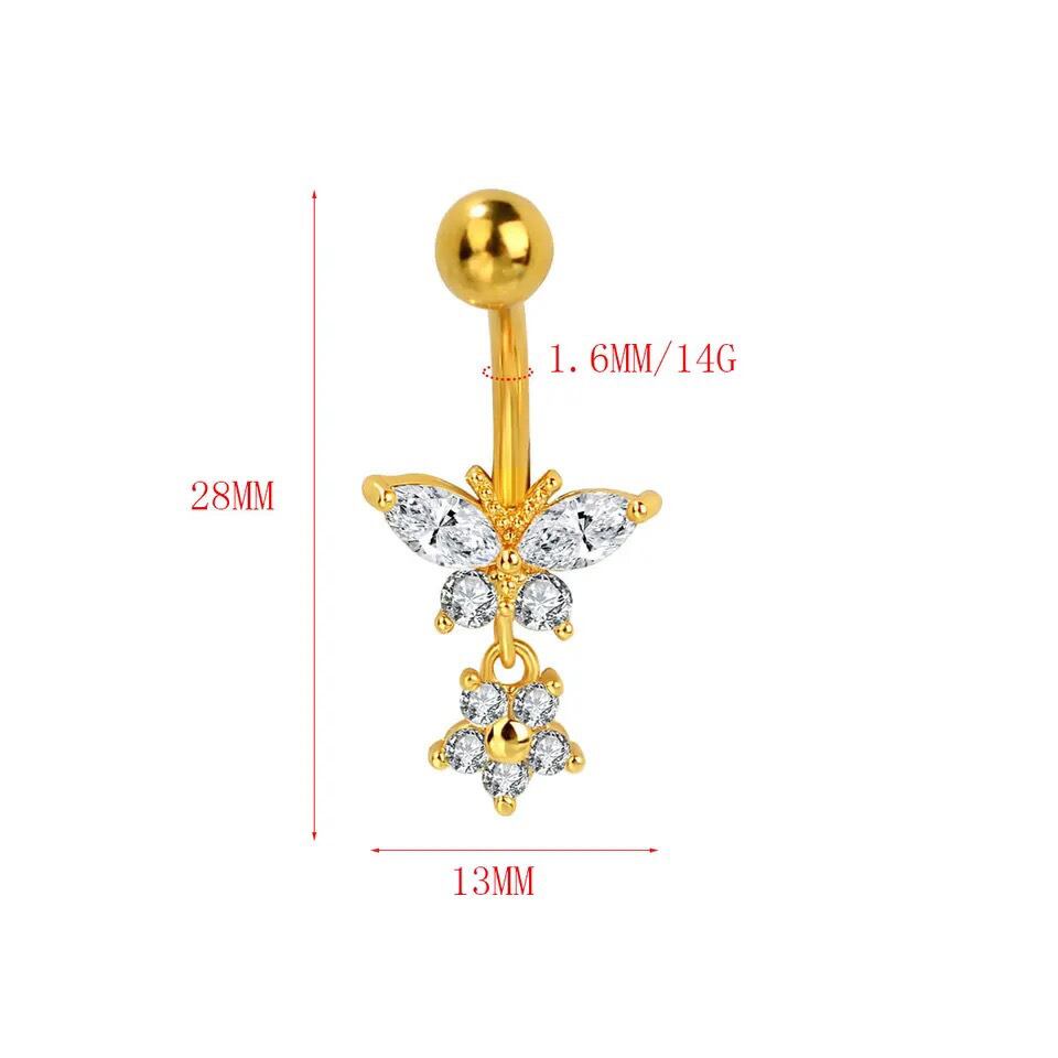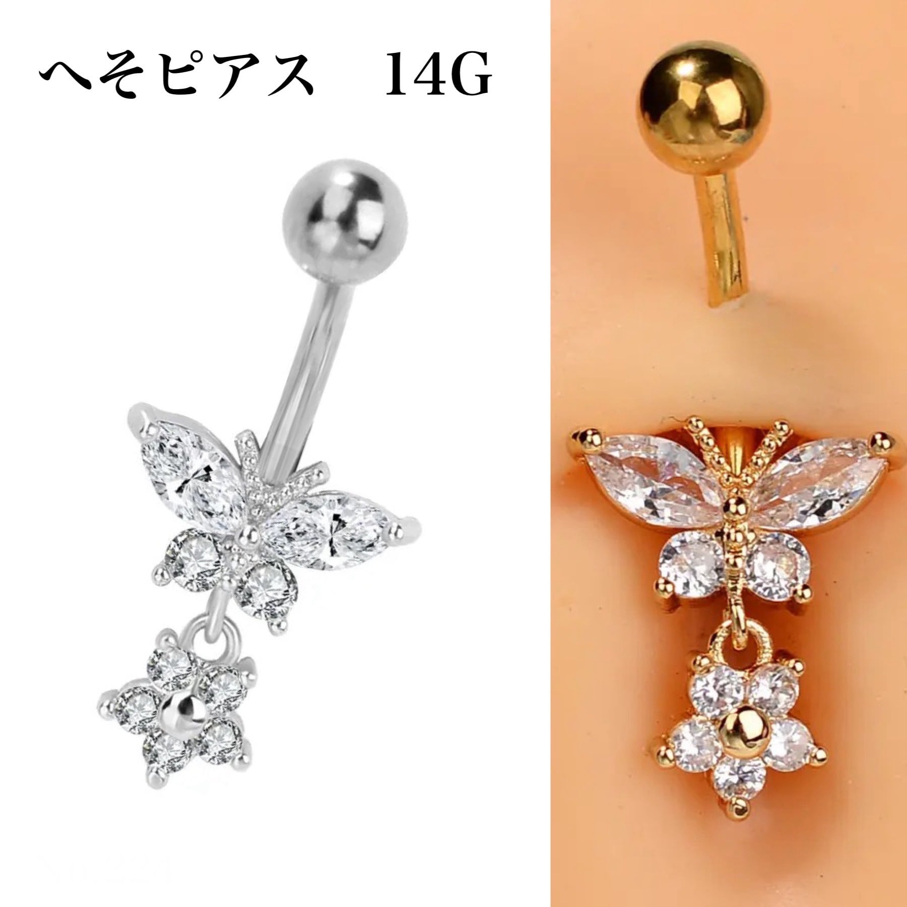 224:へそピアス 14G バタフライ 蝶 ジルコン 花 フラワー シルバー ゴールド ボディピアス 可愛い フェミニン きらきら ゆらゆら おしゃれ 耳たぶ バナナバーベル