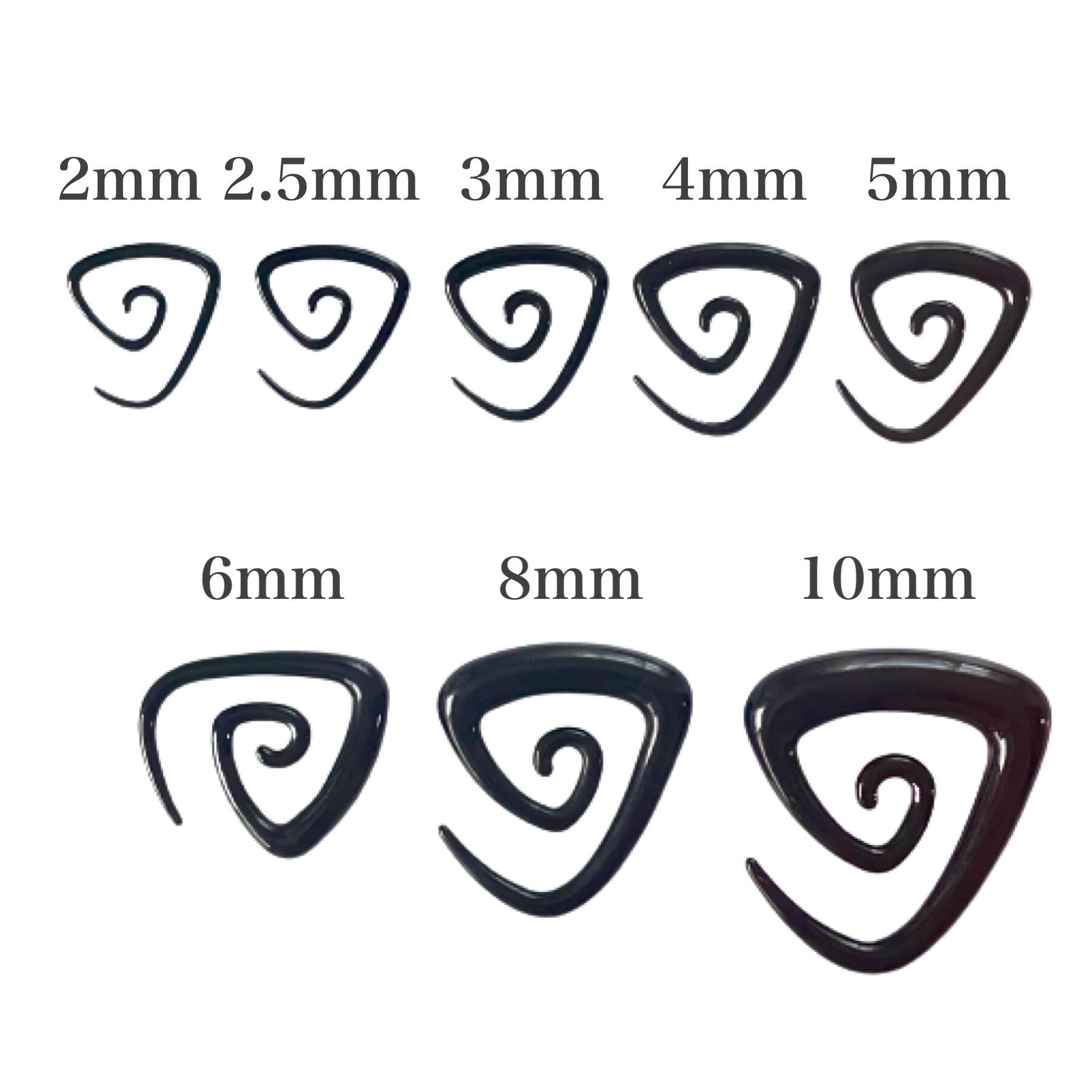 サイズ:12G(2mm)、10G(2.5mm)、8G(3mm)、6G(4mm)、4G(5mm)、2G(6mm)、0G(8mm)、00G(10mm)