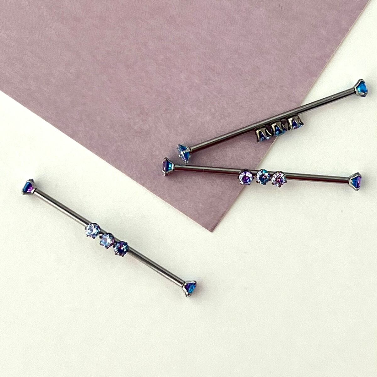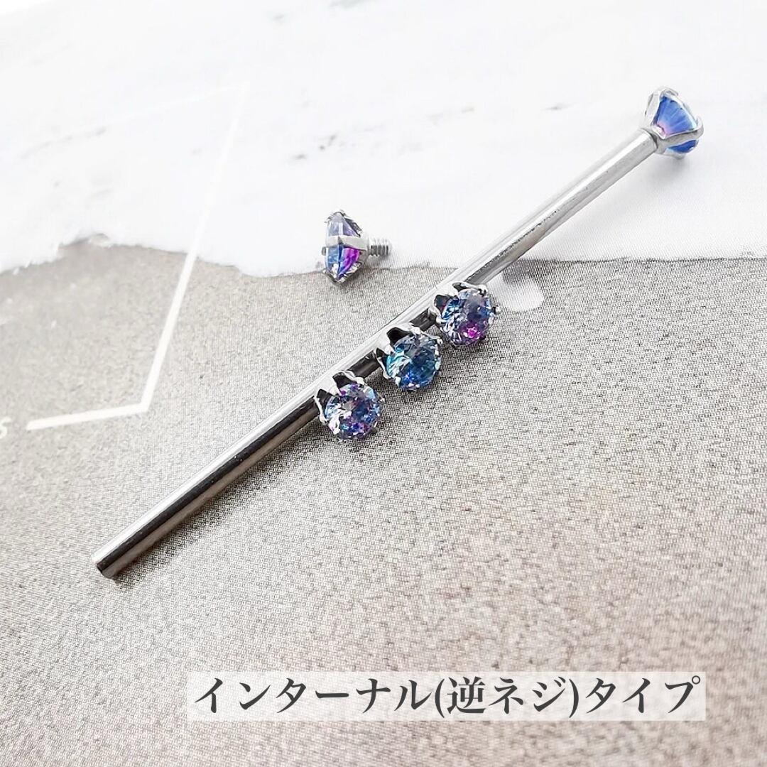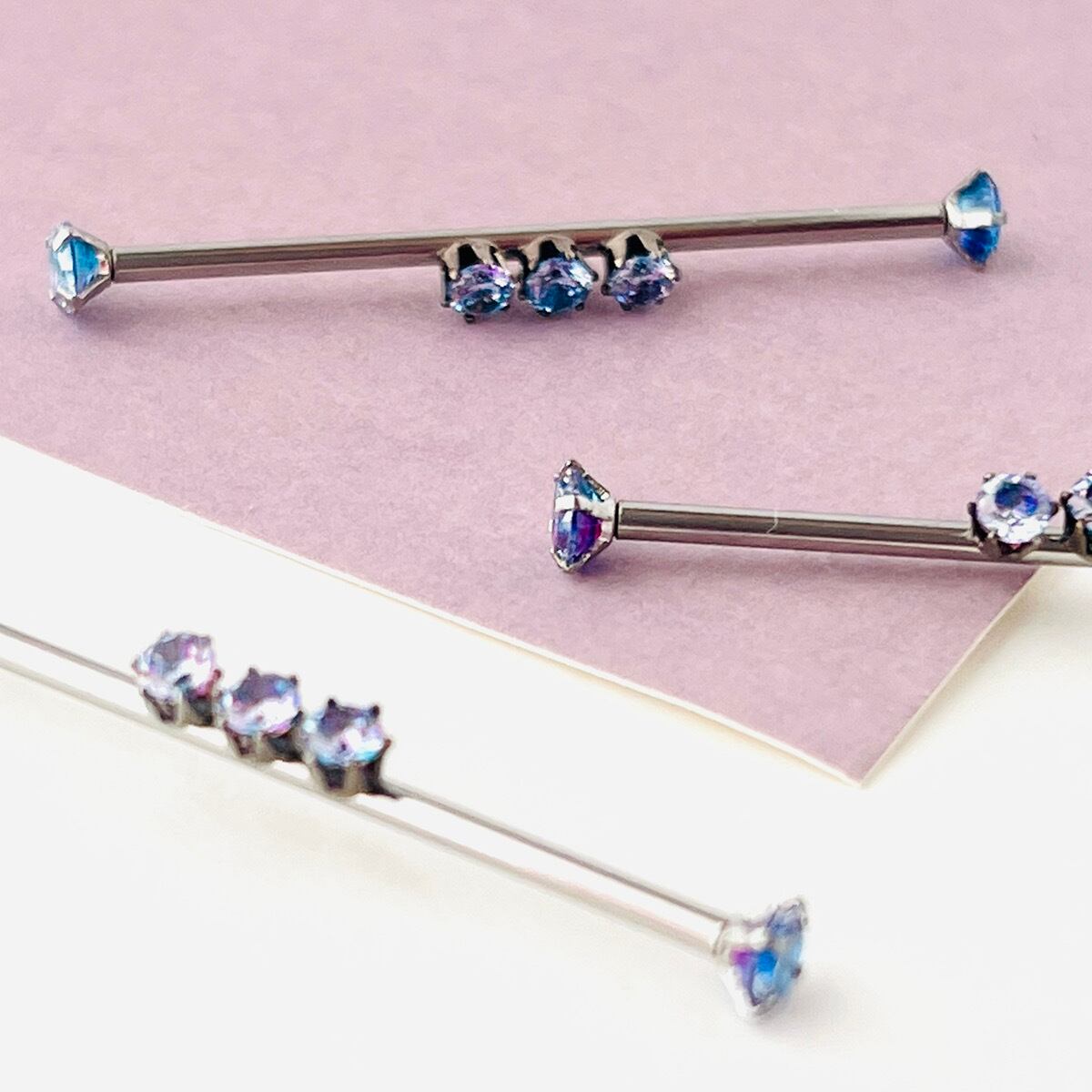 242:ボディピアス インダストリアル ジルコン 3連 上品 インダス 14G 14ゲージ ボディピ 金属アレルギー対応 可い レディース インダス ロングバーベル ストレートバーベル シルバー ブルー パープル きらきら